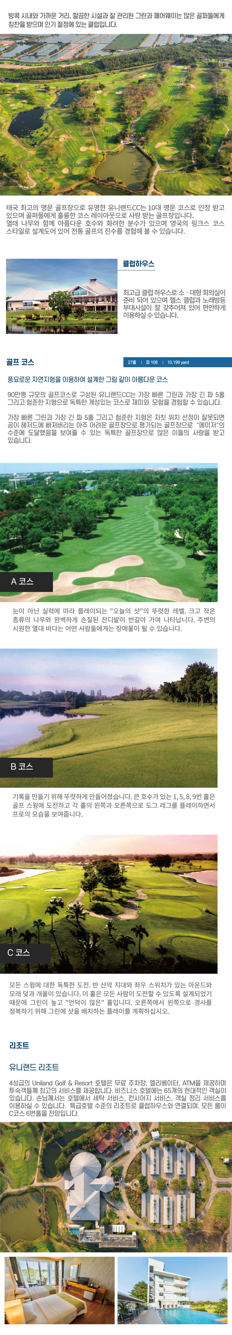 | 불포함사항 | [불포함내역] • 캐디피(350바트/18홀/인) • 전동카(700바트/18홀/인) • 캐디팁(300바트/18홀/인) • 미팅&샌딩비($50/인) • 기타개인경비 |
