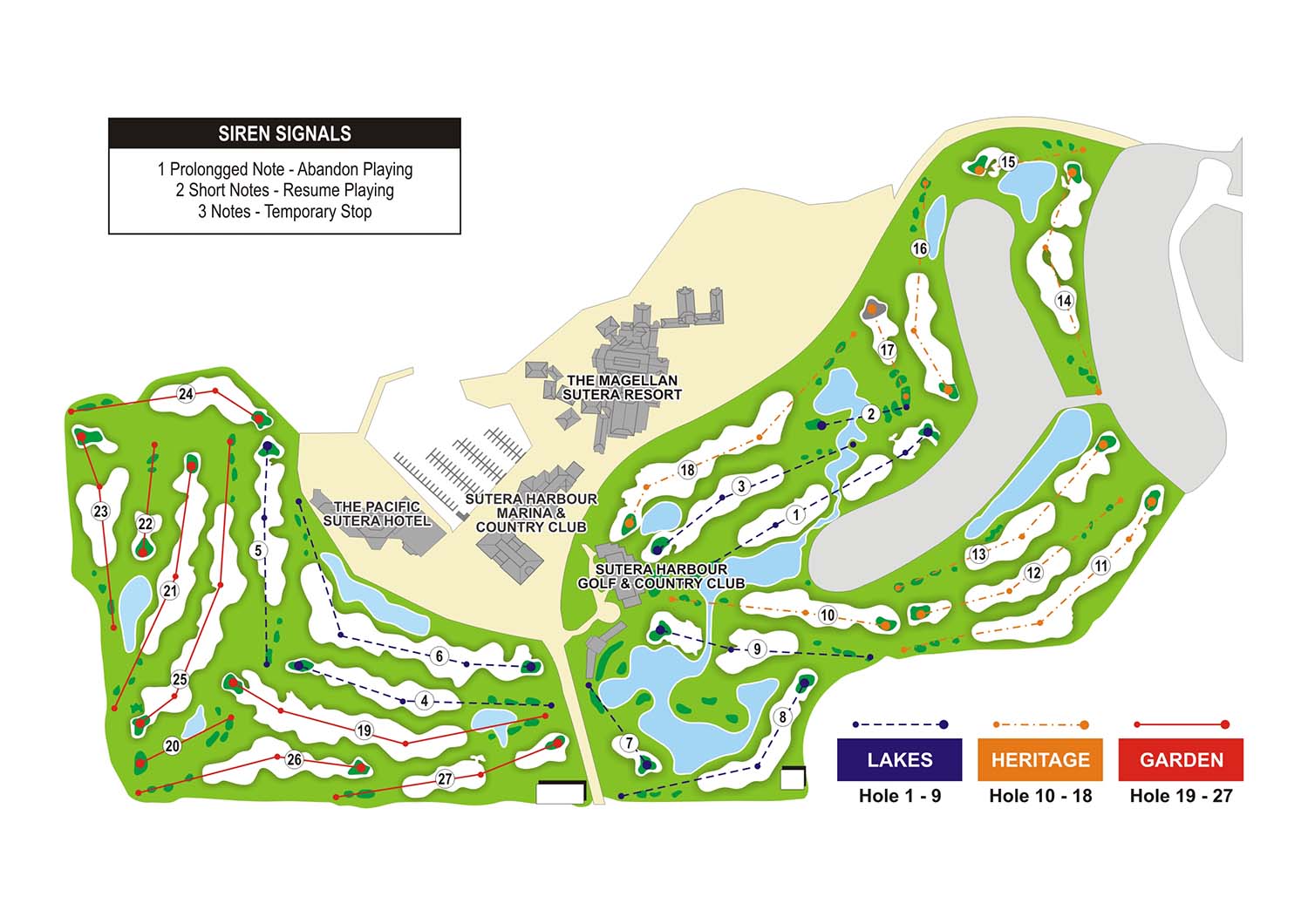 세계적인 골프 디자이너 Graham Marsh가 디자인한 27홀의 챔피언십 골프 코스에는 버뮤다 잔디가 깔려 있습니다. 레이크 코스, 헤리티지 코스, 가든 코스로 구성되어 있으며 많은 국제대회를 개최하였습니다.