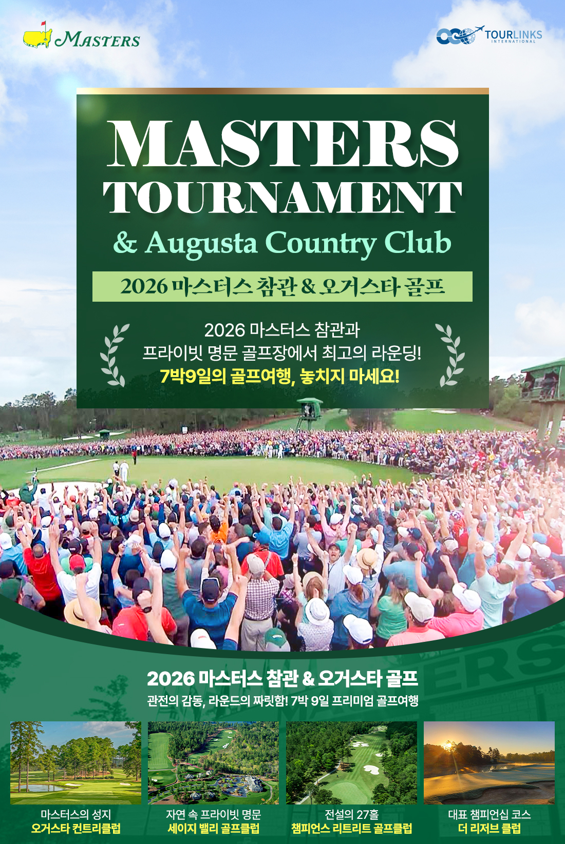 | 포함사항 | * 마스터스 연습라운드+최종전 입장권 * 그린피+카트비(4인1카트) 18홀*3회+그린피 18홀*1회 * 고급 주택 7박(2인1실)+조식 * 전일정 석식 * 전일정 전용차량(14인승 버스 1대)+한국인 가이드 * 3억원 해외 여행자보험 |
