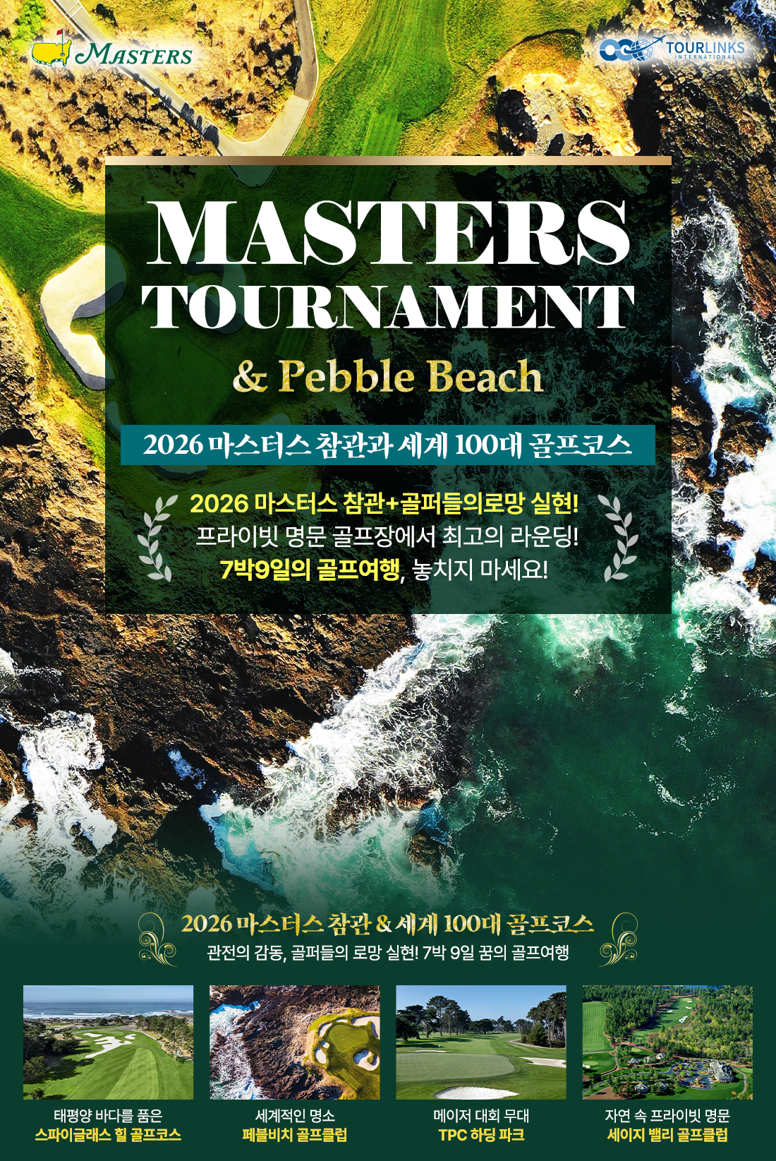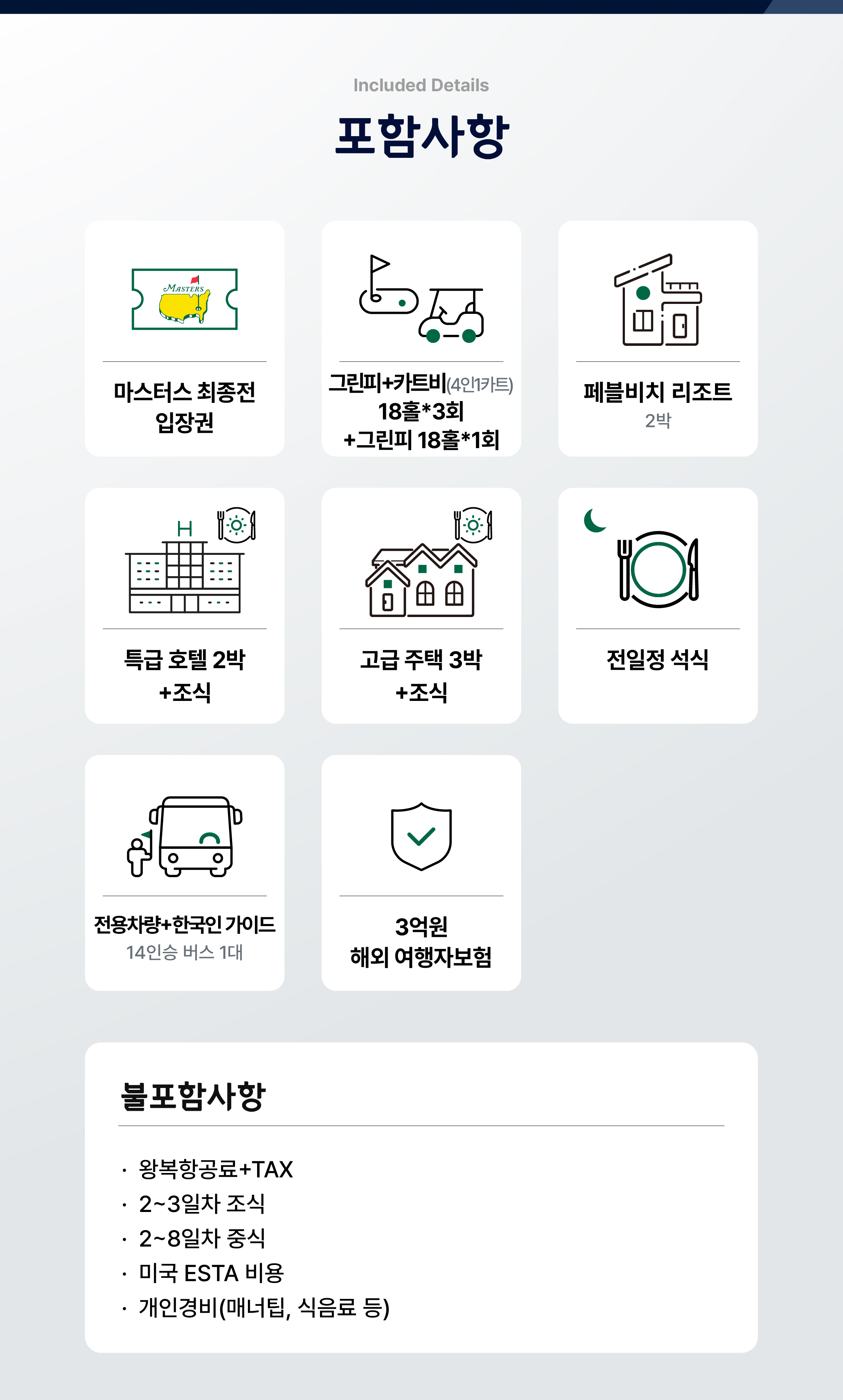 | 포함사항 | * 마스터스 최종전 입장권 * 그린피+카트비(4인1카트) 18홀*3회+그린피 18홀*1회 * 페블비치 리조트 2박 * 특급 호텔 2박+조식 * 고급 주택 3박+조식 * 전일정 석식 * 전일정 전용차량(14인승 버스 1대)+한국인 가이드 * 3억원 해외 여행자보험 |
