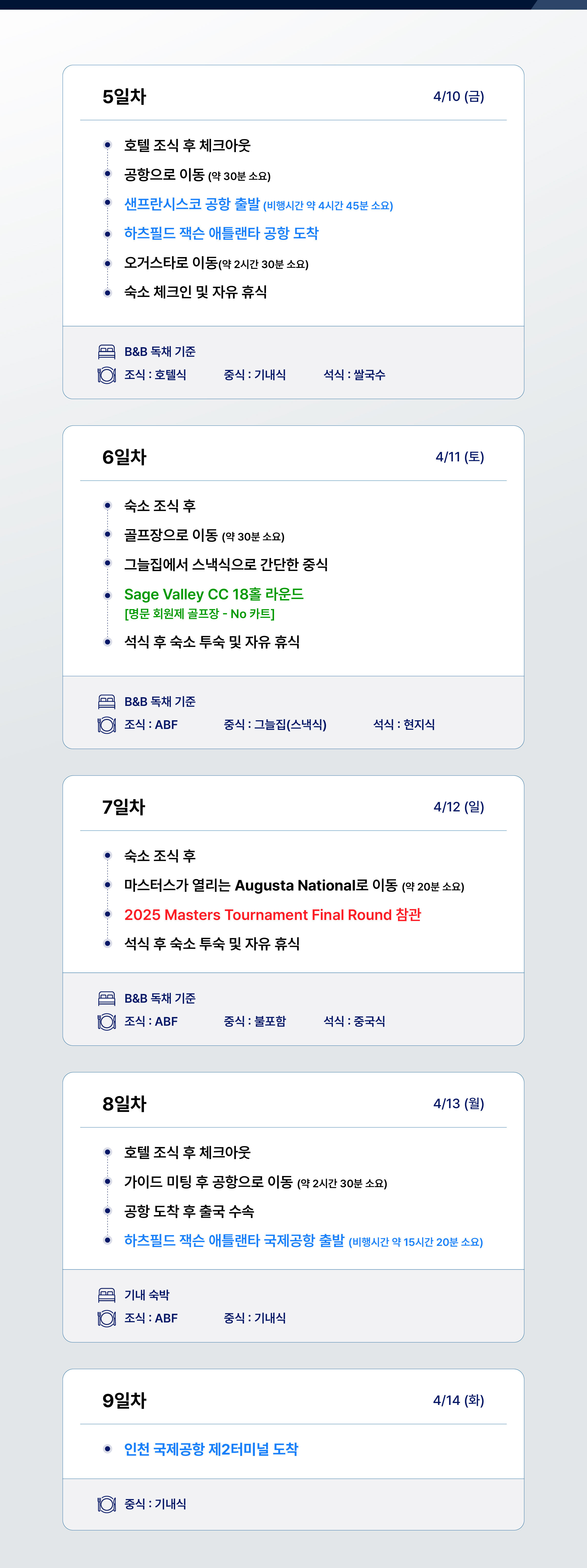 | 오거스타 에어비엔비Augusta Air b&b마스터스 토너먼트의 편안한 관람을 위해 편리한 이동과 일정을 함께하는 일행이 단독으로 사용하는 현지 숙소가 제공됩니다. 일행이 사용하는 독채 숙소가 제공되며 정해진 일정 이외에는 숙소 내에서 편안하게 휴식, 취식 등 안락하고 안전한 사용이 가능합니다. | |||